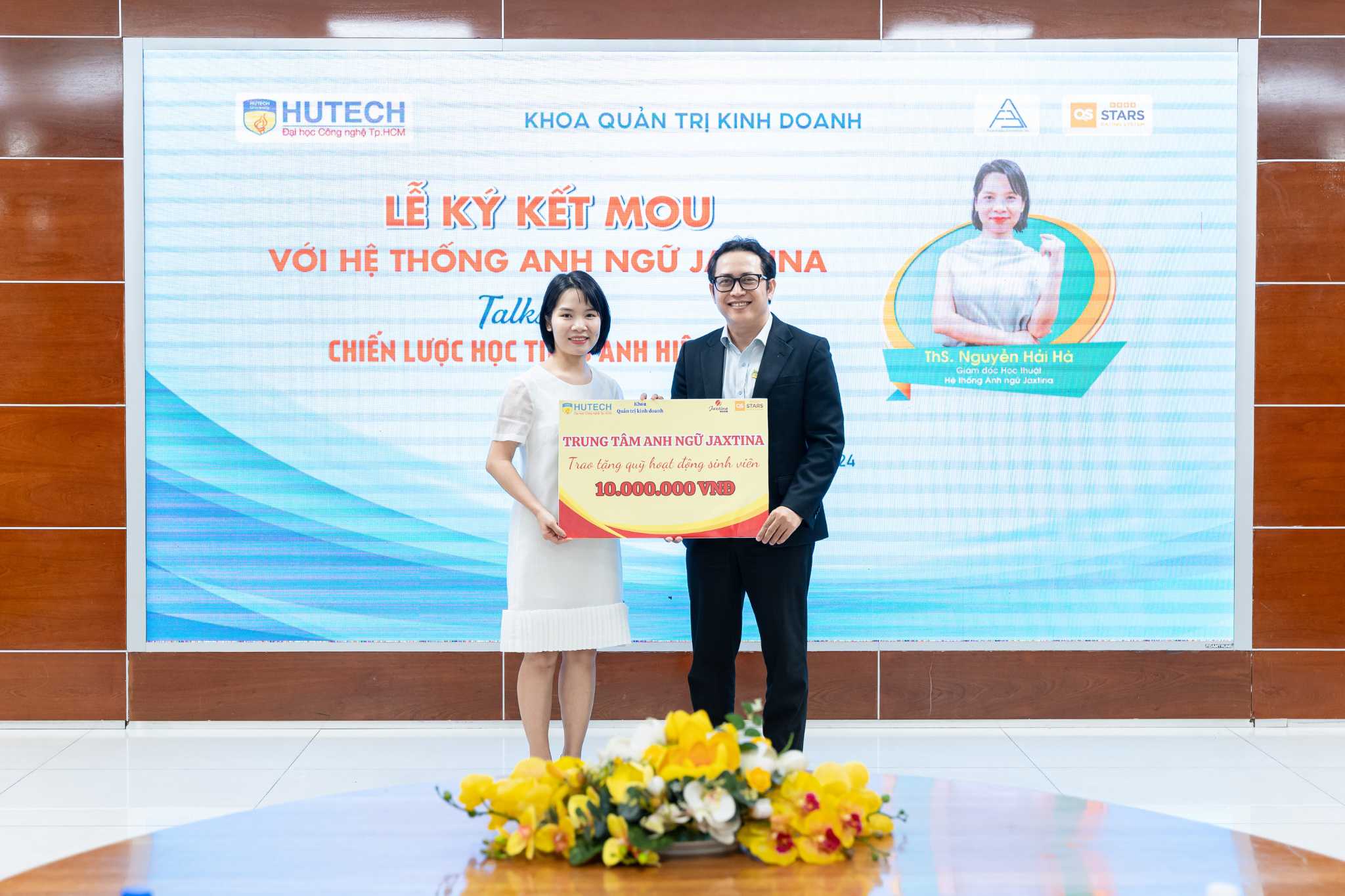 Tại chương trình, ThS. Nguyễn Thị Hải Hà, đại diện Jaxtina, đã trao tặng Quỹ hoạt động sinh viên của Khoa Quản trị kinh doanh (HUTECH) số tiền 10 triệu đồng, thể hiện sự đồng hành và hỗ trợ tích cực của Jaxtina đối với các hoạt động của sinh viên.